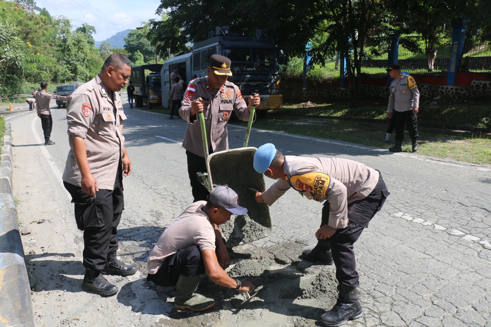 Dengan peralatan seadanya namun penuh semangat, personel Polres Jayapura menutup lubang-lubang yang selama ini seolah menunggu kelengahan pengendara. Setiap sekop material yang dituang bukan sekadar menutup jalan rusak, tetapi menjadi upaya nyata mencegah kejadian serupa terulang.