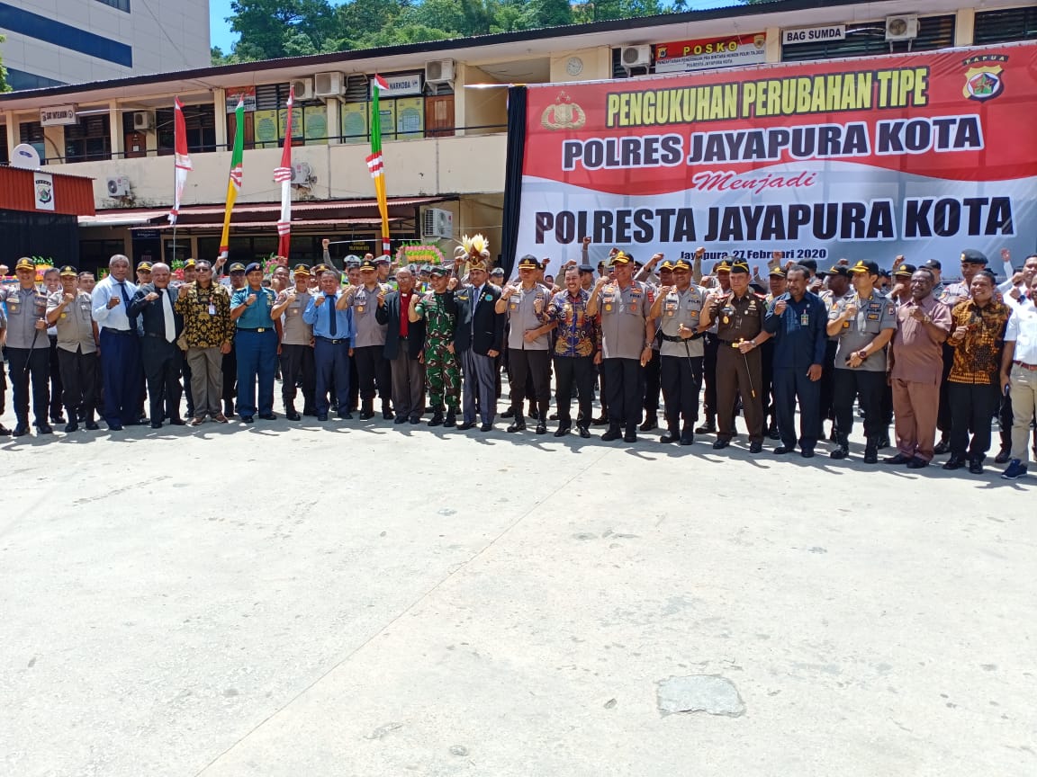 Kilaspapua, Jayapura- Kepolisian Resor Jayapura Kota resmi berubah tipe menjadi Kepolisian Resor Jayapura Kota,(Polresta) Jayapura Kota. Hal itu ditandainya dengan pembukaan tirai pengukuhan perubahan tipe Polres Jayapura Kota menjadi Polresta Jayapura Kota melalui sirene yang dipimpin langsung oleh, Kepala kepolisian daerah,( Kapolda) Papua, Irjen Pol Drs. Paulus Waterpauw bersama Wakil Walikota Jayapura, Kapolresta Jayapura Kota, Kajari, Kepala Imigrasi, Ketua LMA Port Numbay, dan pihaknya lainnya, di Halaman Mako Polresta Jayapura Kota, kamis (27/2/2020).
