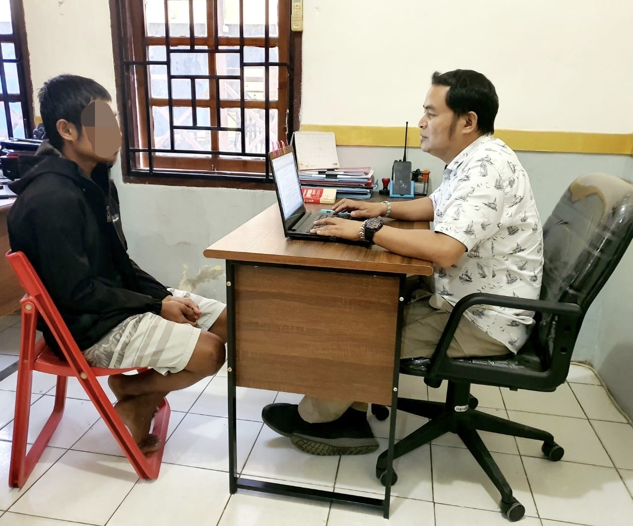 Pelaku pencurian 3 handphone dan uang 1 Juta di Kafe Cycloop Sentani saat menjalani pemeriksaan oleh penyidik Reskrim Polsek Sentani.(Foto. Humas Polsek Sentani)