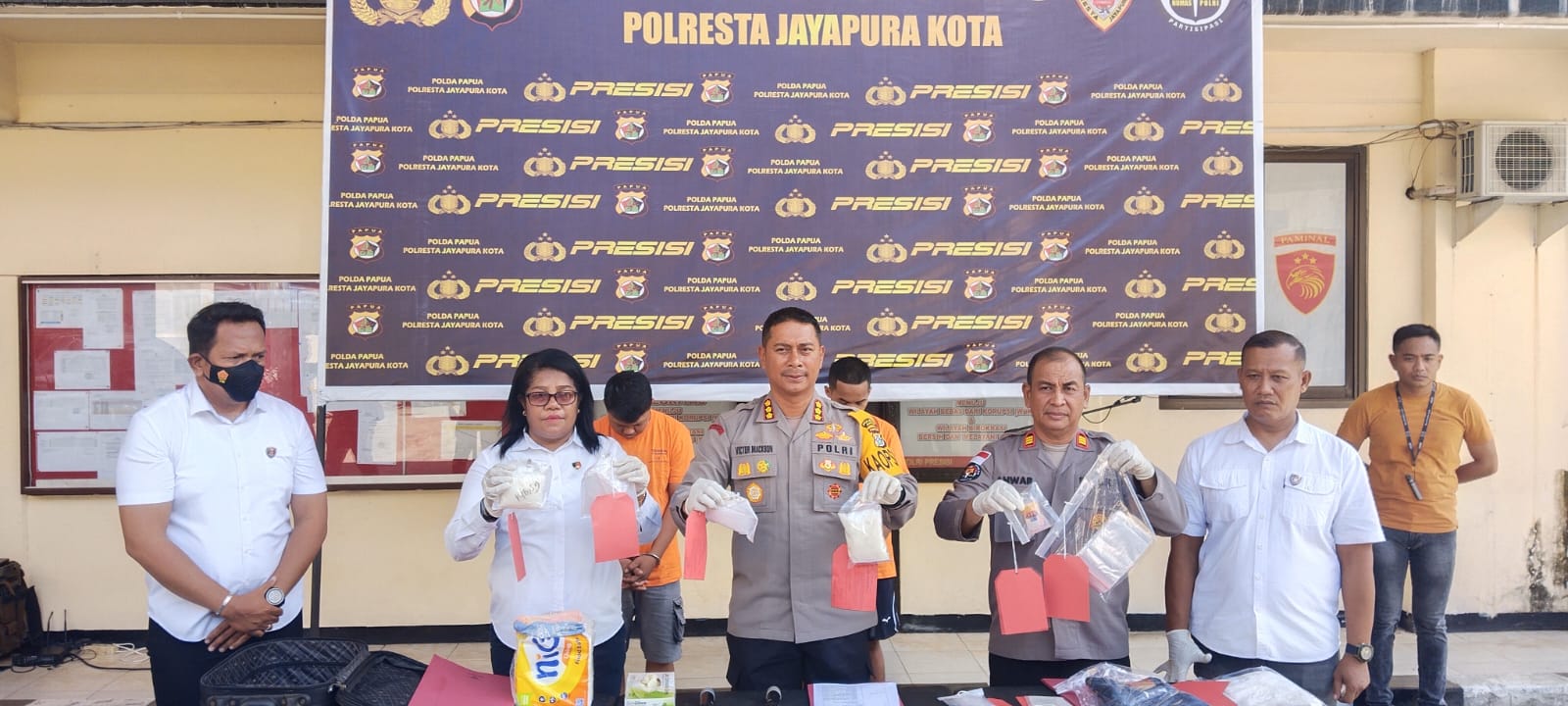 Kapolresta Kombes Pol Dr. Victor D. Mackbon, S.H., S.IK., M.H., M.Si didampingi didampingi Kasat Resnarkoba AKP Irene Aronggear, S.H, Kasi Humas AKP Muh. Anwar dan KBO satuan narkoba Ipda Sunot pada Press Conference di Lapangan Apel Mapolresta Jayapura Kota mengatakan, bermula saat penyidik melakukan penyelidikan dan menemukan barang bukti tersebut lebih dari 252,48 Gram.