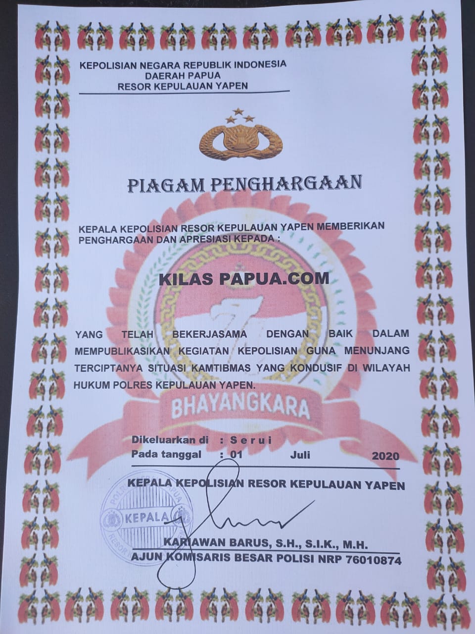 Penghargaan tersebut, diberikan langsung oleh Kapolres Kepulauan Yapen, AKBP Kariawan Barus SH SIK MH kepada 11 Media baik media Cetak,TV,Radio dan Online yang diterima oleh perwakilan wartawan dari masing-masing media. Penyerahan ini dilakukan disela-sela acara syukuran HUT Bhayangkara yang digelar di gedung Gor Mapolres Yapen, Rabu (1/7/2020).