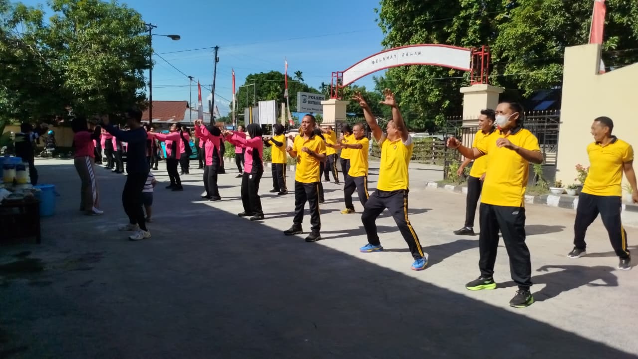 Kapolsek bersama sejumlah personil saat senam bersama dengan 45 ibu byangkari Kota Sentani guna menjalin kekompakan.(Foto. Istimewa)