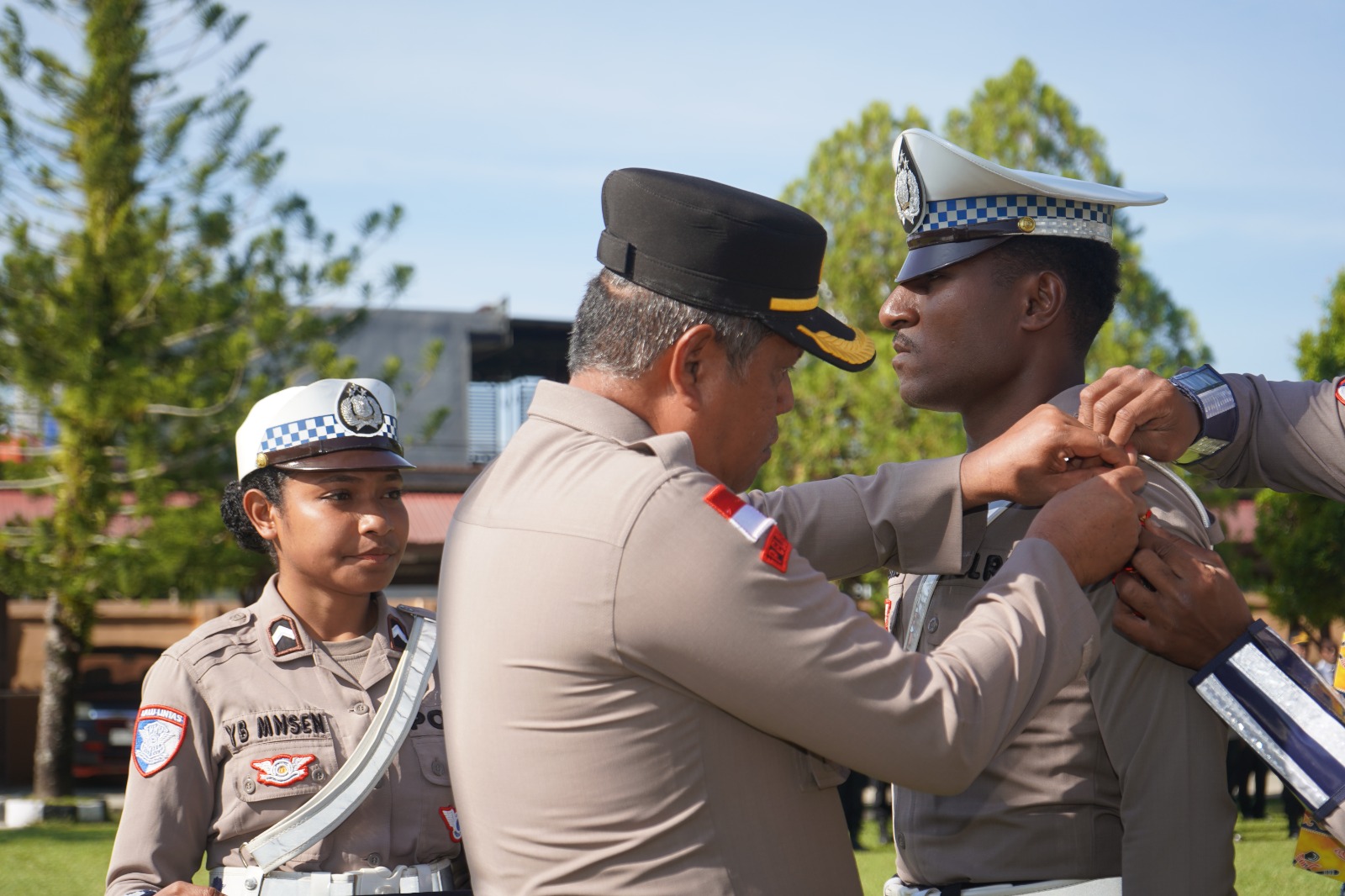 Wakapolres Jayapura saat menyematkan pita tanda operasi keselamatan Cartenz 2026 resmi digelar dilapangan Mapolres Jayapura.(Foto. Humas Polres Jayapura)