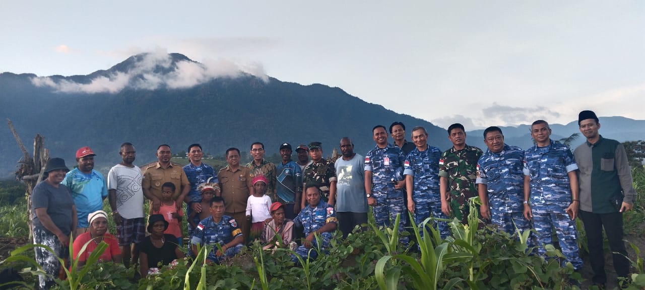 Danlanud saat berphoto bersama masyarakat sekitar dilahan yang ditanami sayuran,jagung dan pisang di Kawasan Lanud Silas Papare.