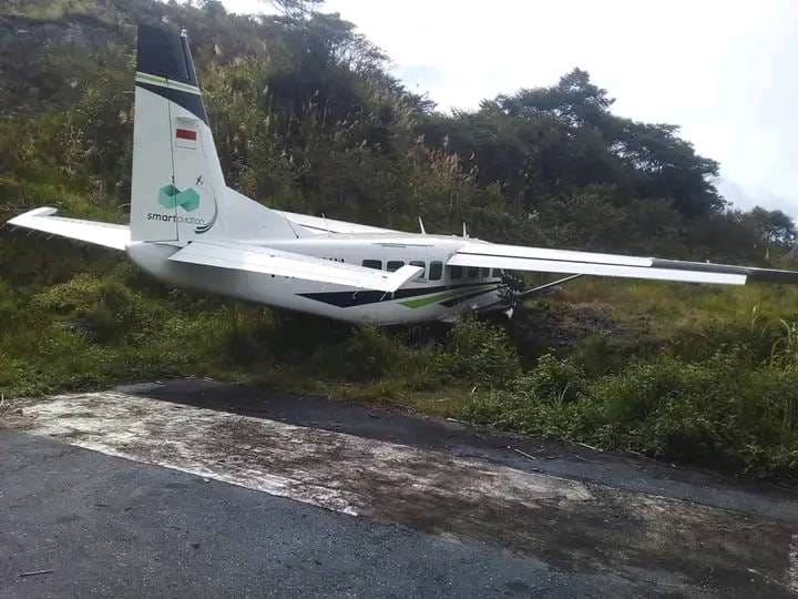 Pesawat Smart Aviation terlihat tergelincir di Bandara Sinak Kabupaten Puncak . Beruntung tidak menimbulkan korban jiwa.(Foto. Humas Polda Papua)