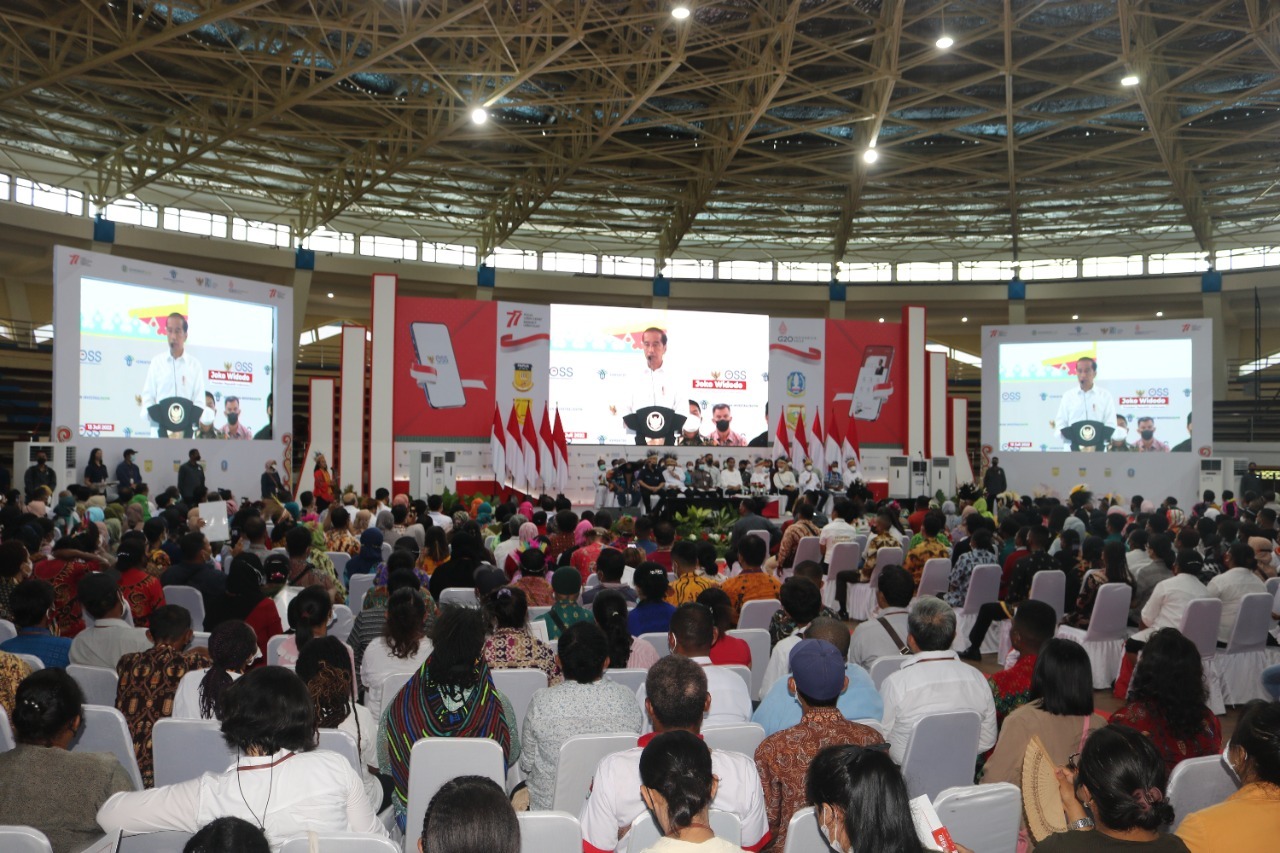 Kilaspapua, Jayapura- Presiden RI Ir. H. Joko Widodo didampingi ibu Iriana Jokowi memberikan secara langsung Nomor Induk Berusaha (NIB) kepada para pelaku Usaha Mikro Kecil (UMK) perseorangan yang di GOR Toware (HMS), Kabupaten Jayapura, Rabu (31/8/2022).