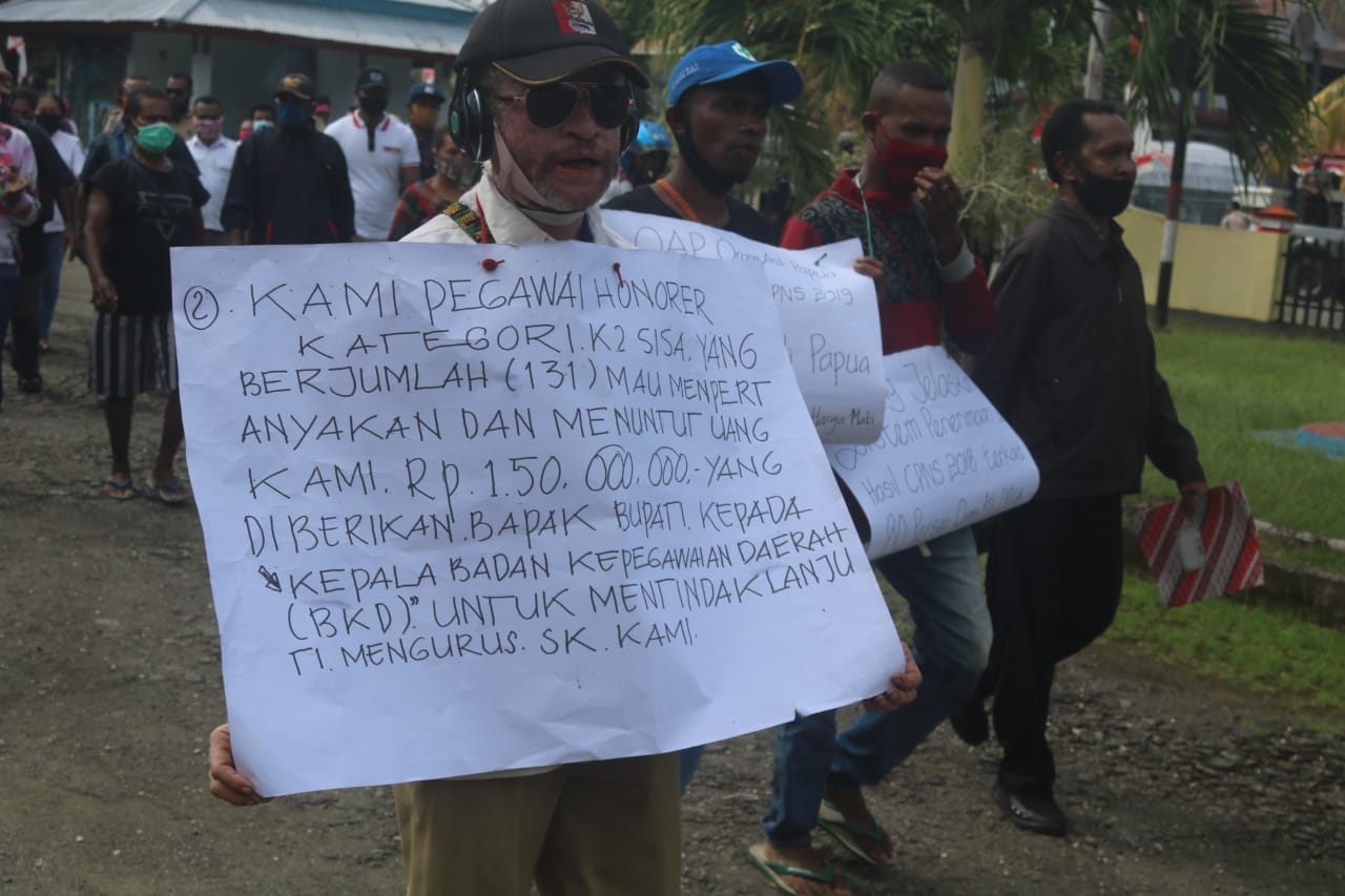 Selain itu, Kordinator Aksi melalui sekertaris Lowdik Kayoi yang ditemui usai kegiatan menyampaikan bahwa salah satu tuntutan dalam aksi demo kali ini, adalah mempertanyakan nasib dari 131 tenaga honorer  yang  kecewa karena belum diangkat menjadi PNS di Kabupaten Kepulauan Yapen.