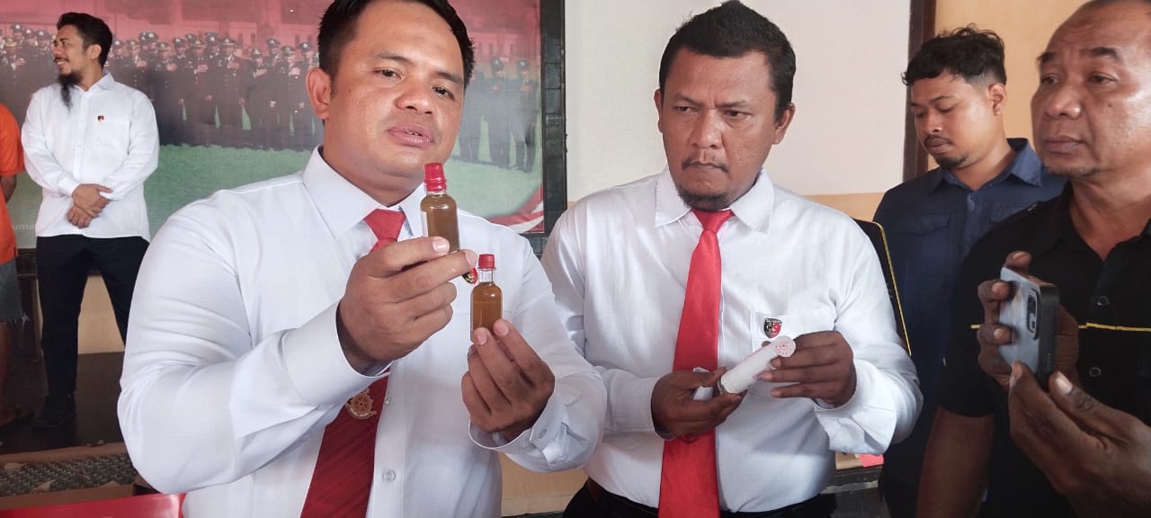 Kasatreskrim Polres Jayapura saat menunjukkan perbedaan minyak gosok asi dan palsu.