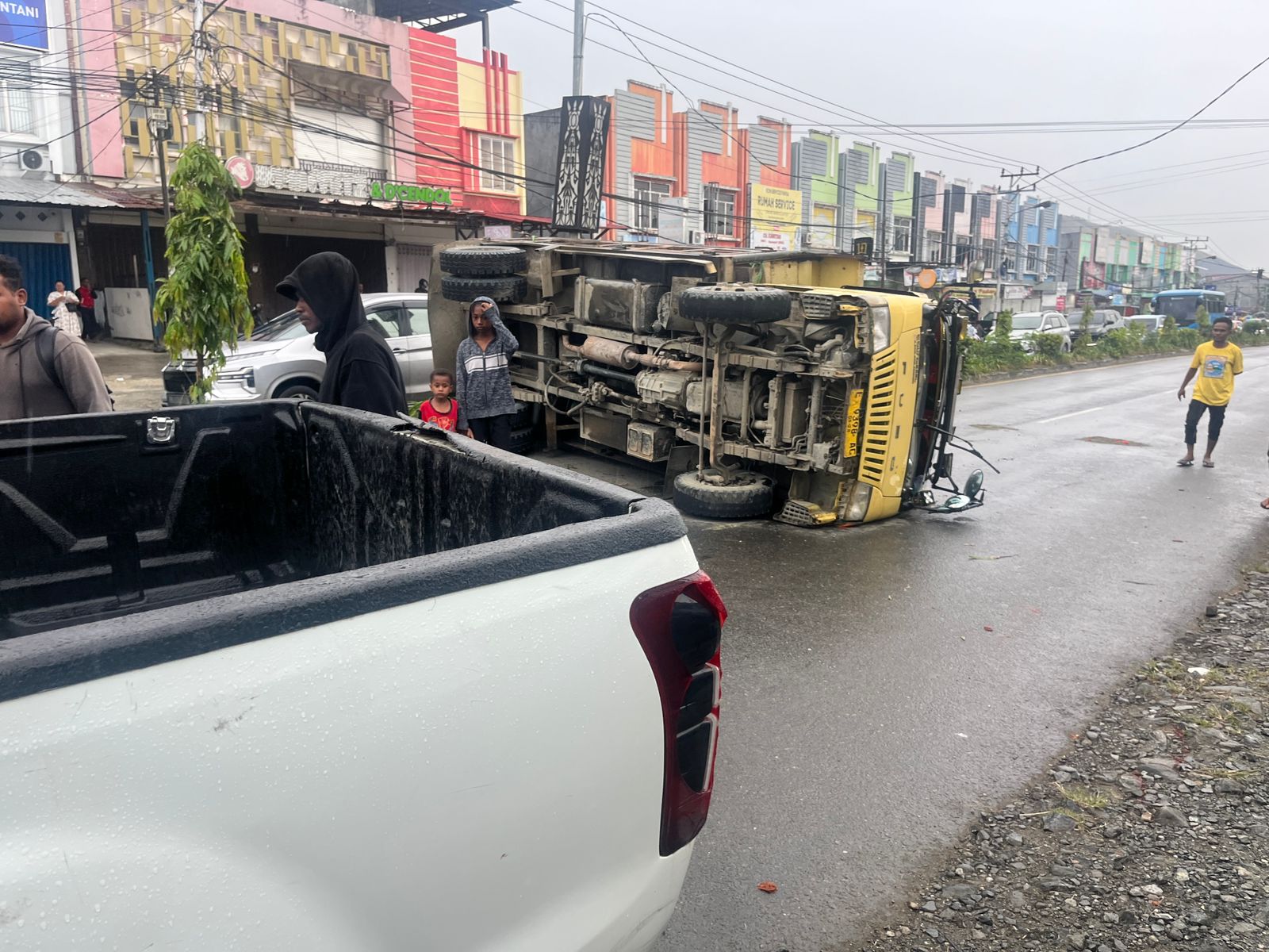 Kilaspapua, Sentani – Satu dari 19 penumpang truk yang terbalik akibat alami kecelakaan lalu lintas tunggal di Jalan Raya Abepura–Sentani, di mata jalan masuk Stadion Barnabas Youwe, depan Rumah Bernyanyi Cycloop Sentani, Kabupaten Jayapura Minggu pagi (19/4/2026) sekitar pukul 07.30 WIT dinyatakan meninggal dunia.