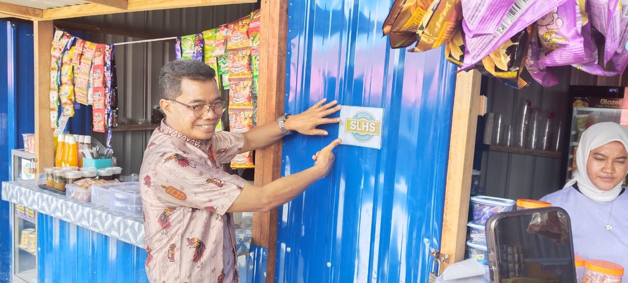 Kepala sekolah SMKS TIK Sentani saat menempelkan stiker sehat di lapak kantin sehat usai diresmikan