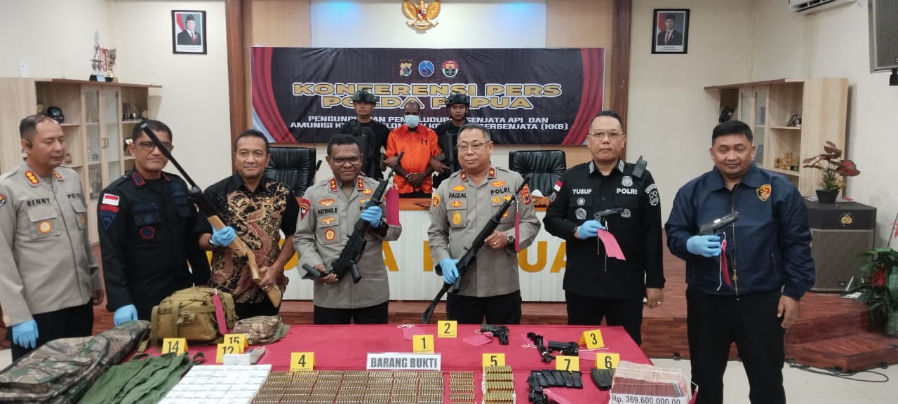 Kapolda Papua, Irjen Pol Patrige R. Renwarin, S.H., M.Si didampingi Wakapolda Papua, Brigjen Pol Dr. Faizal Ramadhani, S.Sos., S.IK., M.H pada press conference pengungkapan penyelundupan senpi dan amunisi diaula Rupatama Polda Papua mengatakan, tak hanya barang bukti pelakunya juga ada ditangkap yakni, YE alias YM ex anggota TNI Kodam XVIII Kasuari Papua Barat dan YK sebagai supir lajuran serta MP sebagai helper lajuran ,” katanya, sabtu (8/3/2025).