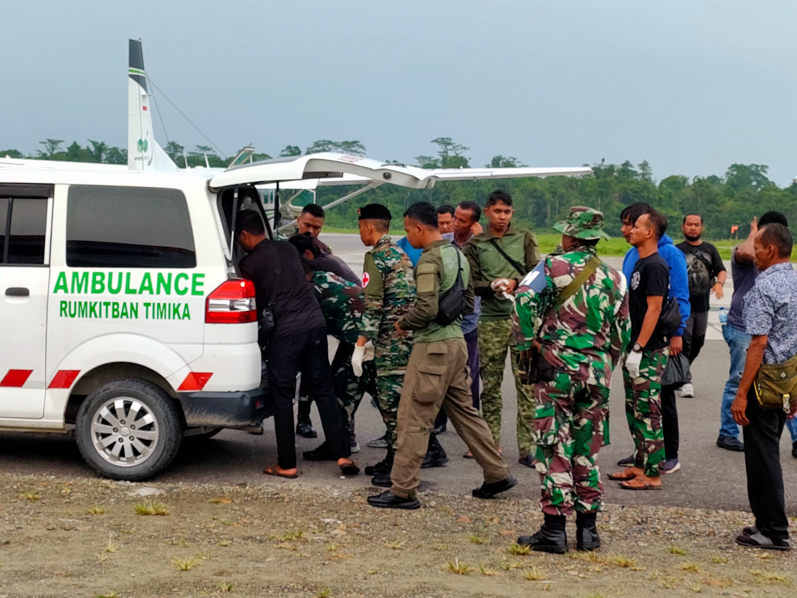Mobil Ambulance milik Rumkitban Timika yang membawa jenazah almarhum Praka Jumardi dan pendamping meninggalkan Bandara Moses Kilangin Timika menuju RSUD Kabupaten Mimika. Jenazah Alm. Praka Jumardi akan disemayamkan di Aula Benteng Merah Puti Kodim 1710/Mimika,” ungkapnya.