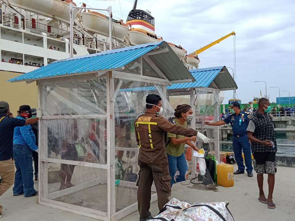 Setiap penumpang yang tiba di Pelabuhan Biak harus mel,asuki ruang Disinfektan.(Foto.Dessy)