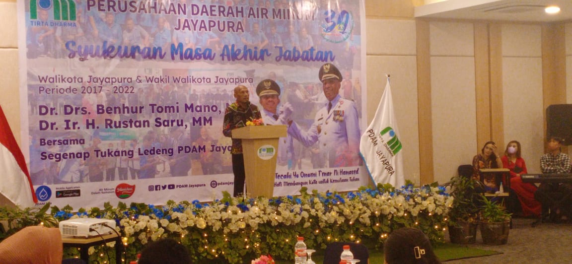Kilaspapua, Jayapura- Perusahaan Daerah Air Minum,(PDAM) Jayapura menggelar syukuran masa akhir jabatan Walikota Jayapura dan Wakil Walikota Jayapura Periode 2017-2022 Dr. Drs. Benhur Tomi Mano,MM dan Dr. Ir. H. Rustan Saru, MM disalah satu hotel di Kota Jayapura, Senin malam (23/5/2022).