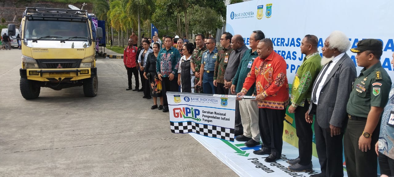 Kilaspapua, Sentani – Bank Indonesia, (BI) Provinsi Papua menggelar Gerakan nasional pengendalian inflasi pangan,(GNPIP) Provinsi Papua 2025 dihalaman kantor Gubernur Papua. Hal itu ditandai dengan pelepasan 2 trek bahan makanan berupa beras ke daerah pegunungan oleh Wakil Gubernur,(Wagub) Papua, Aryoko Rumaropen, Kamis (13/11/2025).