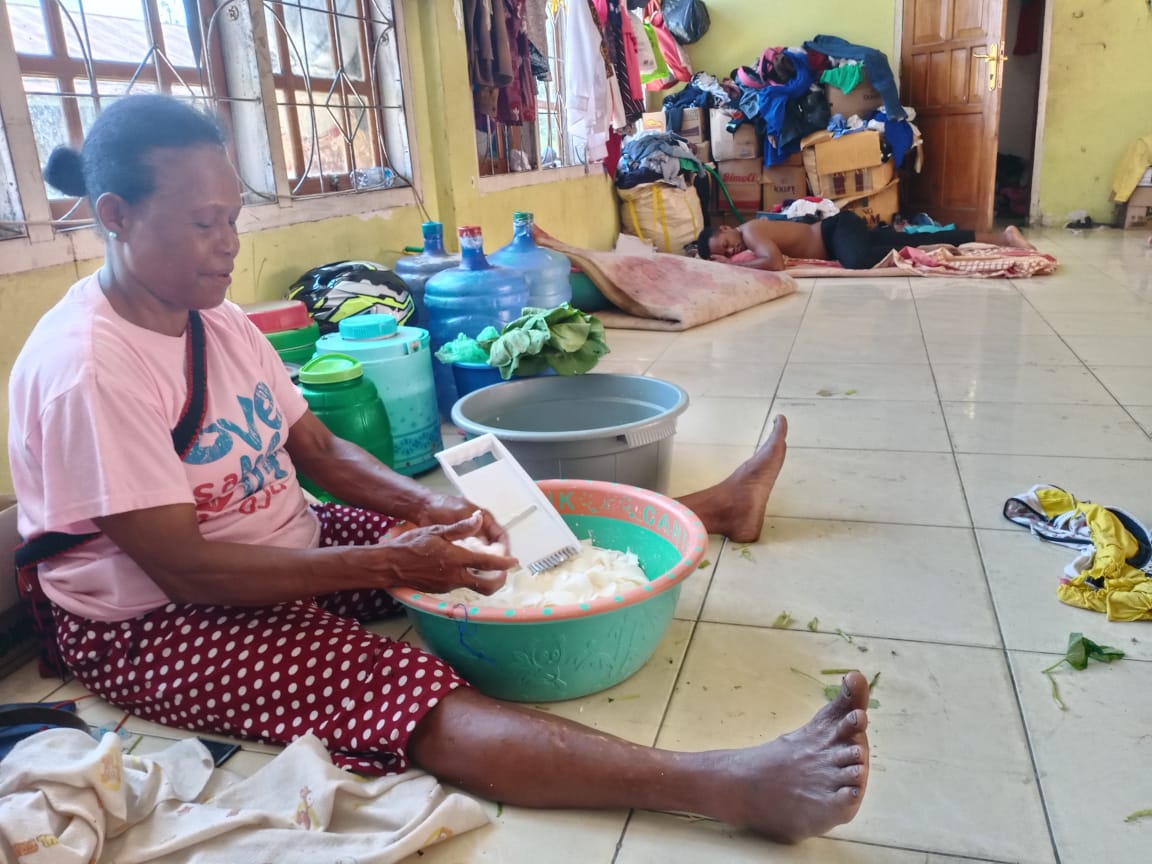 Salah seorang Mamak sedang melakukan aktivitasnya di Posko pengungsian Aula SKB Kemiri, Sentani.