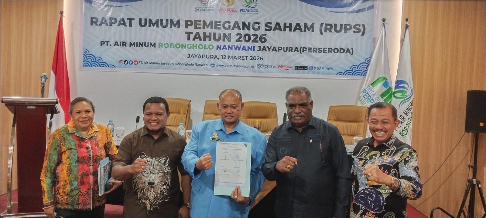 Walikota didampingi Wakil Bupati Jayapura serta Wakil Walikota dan Komisaris saat menandatangani LKPJ PT. Air Minum Robongholo Nanwani Jayapura (Perseroda).