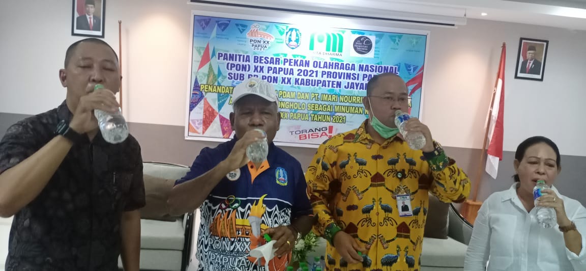 Kilaspapua, Sentani- Perusahaan Daerah Air Minum ,(PDAM) Jayapura untuk ketiga kalinya menjalin kerjasama dalam hal air minum Robongholo sebagai minuman resmi PON XX Papua tahun 2021. Kali ini, Giliran penandatangan MoU dengan PT. Imari Nourriture Indonesia dengan disaksikan oleh Bupati Jayapura, Mathius Awoitauw, SE,M.Si selaku Ketua Umum Sub PB PON Klaster Kabupaten Jayapura disalah satu hotel di Kota Sentani, Kamis (19/8/2021).