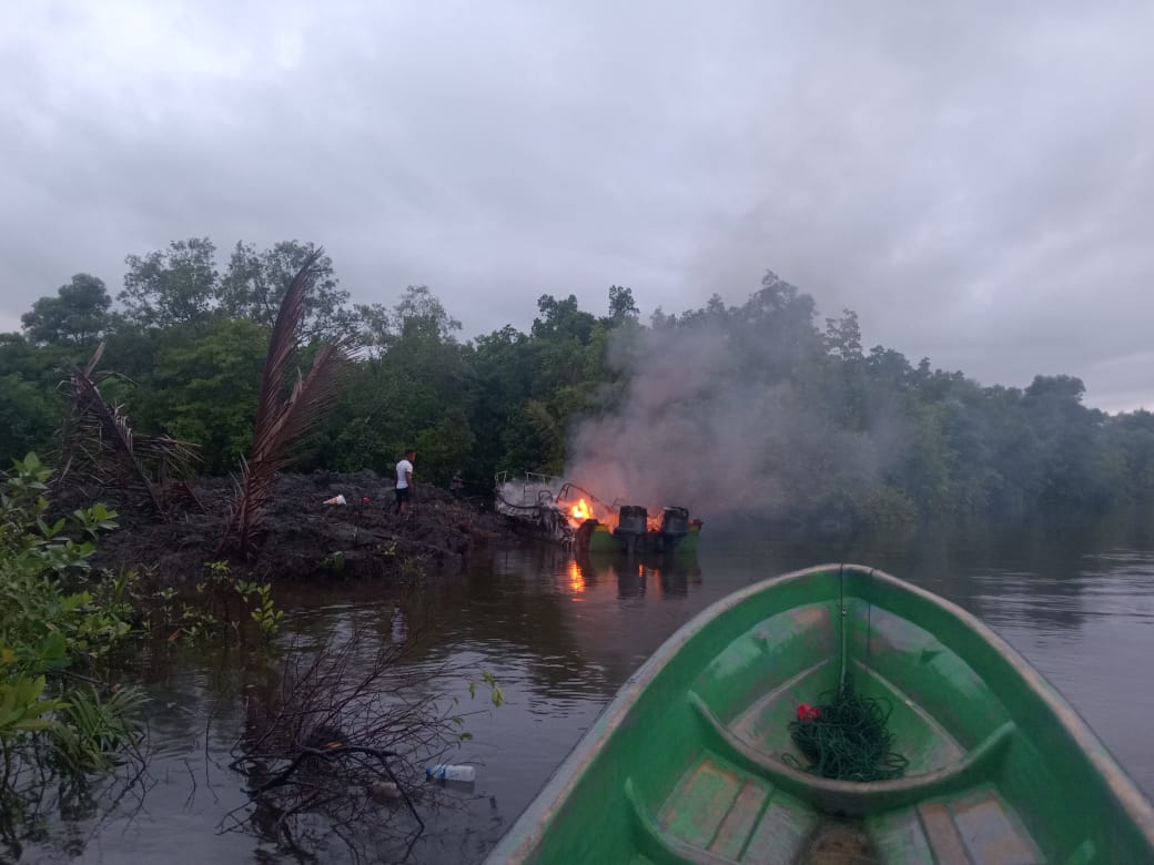 Tampak Kapal Speed boat yang sedang terbakar terbakar.(Foto. Humas Polres Waropen)