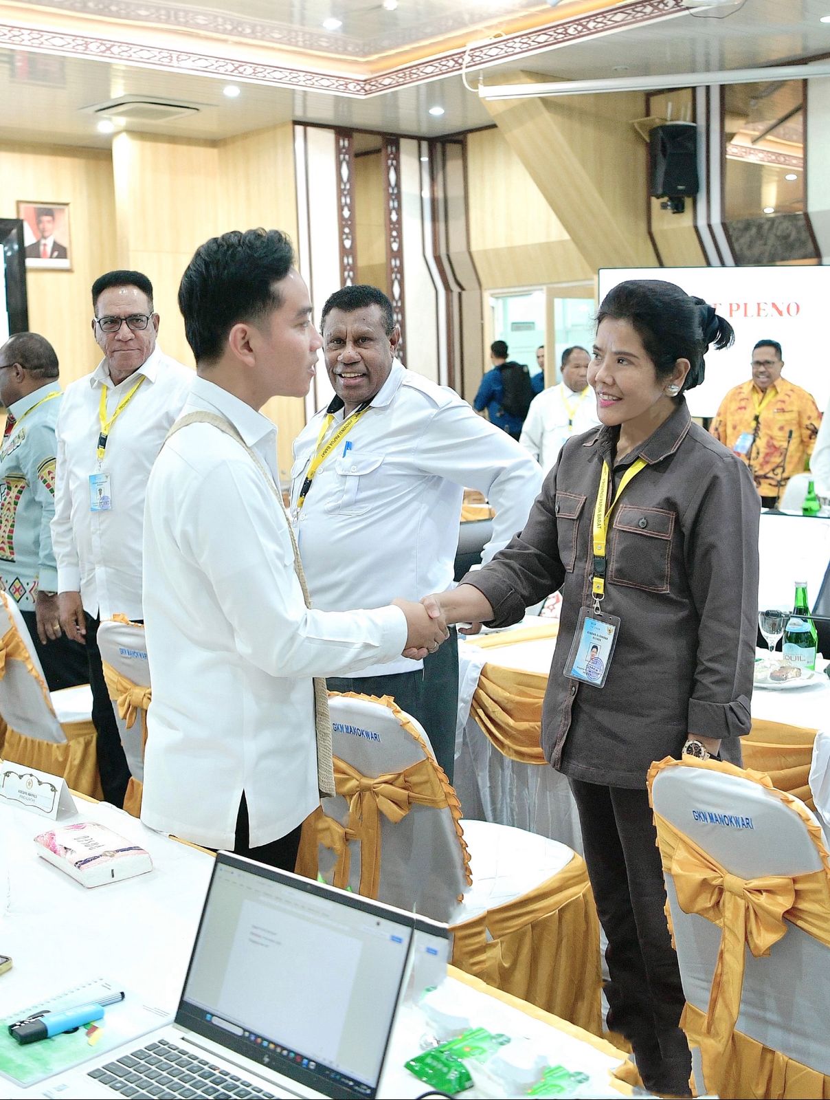 Anggota Komite Eksekutif Percepatan Pembangunan Otonomi Khusus Papua (KEPP Otsus Papua), Yanni saat bersalaman dengan Wapres Gibran usai rapat BP3OKP di Manokwari. (Foto. Istimewa)