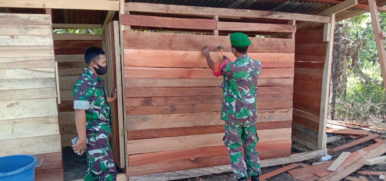 Kilaspapua, Jayapura- Sebagai wujud kemanunggalan TNI bersama rakyat, Babinsa Koramil 1712-06/Bonggo, Serka Louis Plamonia membantu warga dalam pembuatan MCK, di Kampung Kiren, Distrik Bonggo Kabupaten Sarmi, Senin (09/05/2022). Kegiatan tersebut dilaksanakan sebagai bentuk kepedulian Babinsa guna meringankan beban masyarakat.