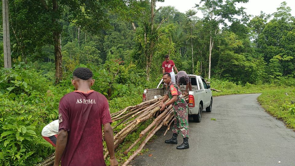 Kilaspapua, Jayapura- Babinsa Posramil 1708-02/BU-Warsa Serda Sukri Goma dan warga setempat saling bergotong-royong mengambil material kayu buah, untuk digunakan merehab plafon rumah ibadah gereja di Kampung Wasani, Distrik Warsa, Kabupaten Biak Numfor, Selasa (24/5/2022).