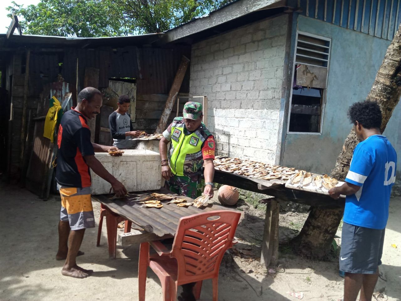 Babinsa Koramil 1708-05/Numfor aktif mendampingi Pelaku usaha ikan asin di Kampung Anday, Distrik Numfor Timur, Kabupaten Biak Numfor.(Foto. Pendam XVII/Cenderawasih)