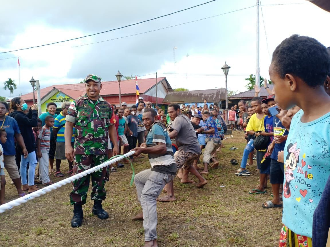 Kilaspapua, Jayapura- Babinsa Koramil 1711-03/ TM Sertu Rofinus bersama rekannya menghadiri kegiatan perlombaan olahraga di lingkungan Se Paroki Hati Kudus Tanah Merah, Kab. Boven Digoel, Jumat (08/07/2022).