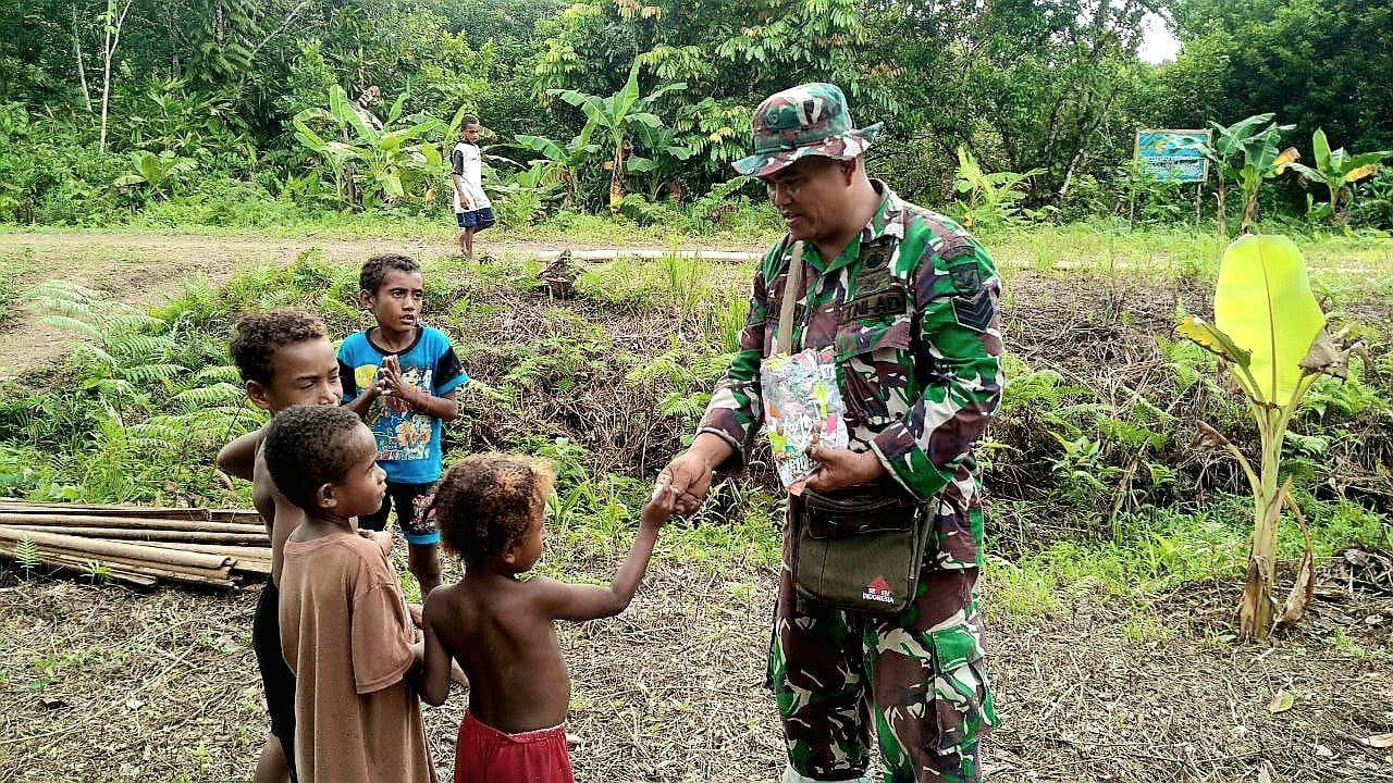 Kilaspapua, Jayapura- Selain membangun perumahan yang layak bagi warga, Satgas TNI Manunggal Membangun Desa (TMMD) Kodim 1709/Yawa juga berbagi keceriaan melalui membagi-bagikan permen kepada anak-anak yang berada di sekitaran lokasi pembangunan TMMD di Kampung Poom I Distrik Poom Kabupaten Kepulauan Yapen, Selasa (3/5/2022).
