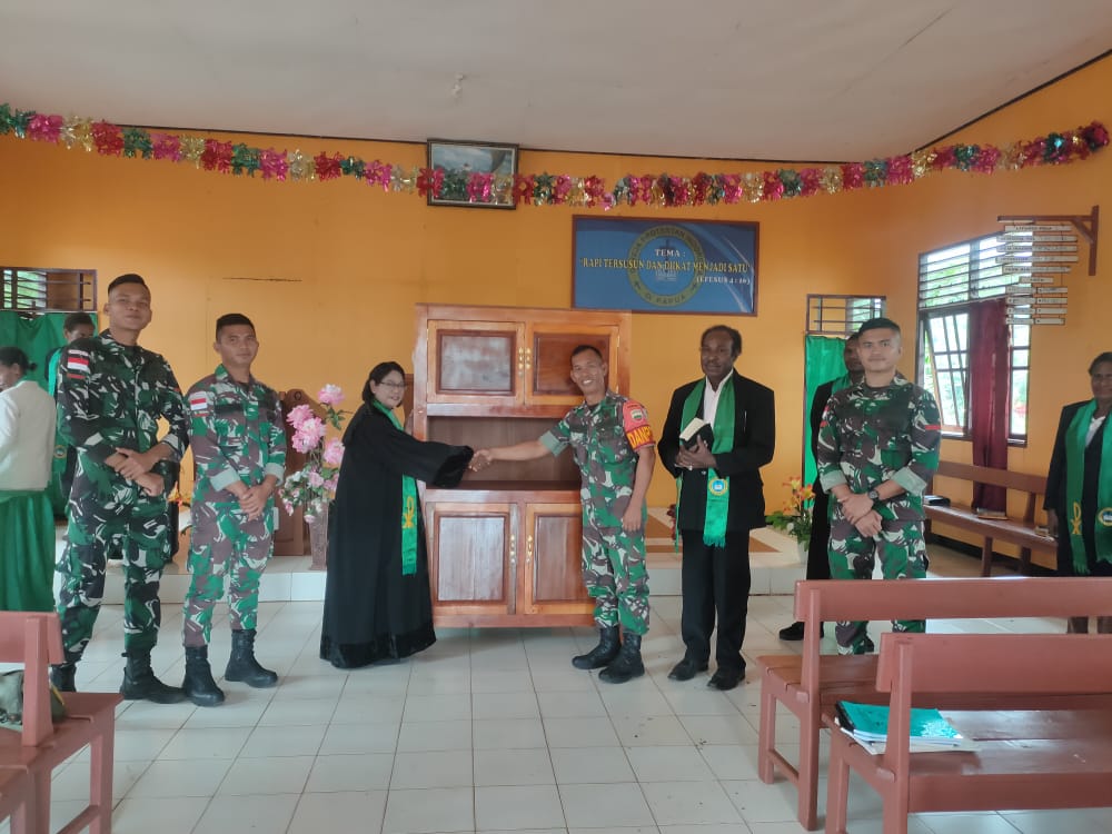 Kilaspapua, Jayapura- Satgas Pamtas RI-PNG Yonif 123/RW memberikan bantuan berupa lemari makan kepada Jemaat Gereja di Papua sebagai bentuk menjaga toleransi antara umat beragama. Kali ini giliran Jemaat Gereja Protestan Indonesia (GPI) Imanuel Toray Klasis Merauke berlokasi di Kampung Toray, Distrik Sota Kabupaten Merauke, Papua, Senin (20/06/2022).
