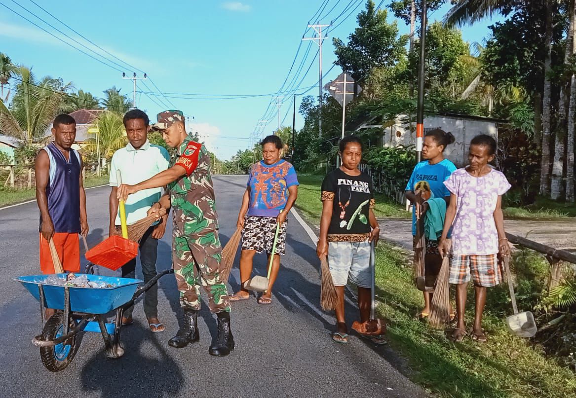 Kilaspapua, Jayapura- Babinsa Koramil 1708-06 Supiori Utara Praka Arthur Sanoy membantu mama-mama membersihkan sampah yang berserakan di sepanjang jalan jalan Kampung Warbor, Distrik Supiori Utara, Kabupaten Supiori, Selasa (07/06/2022).
