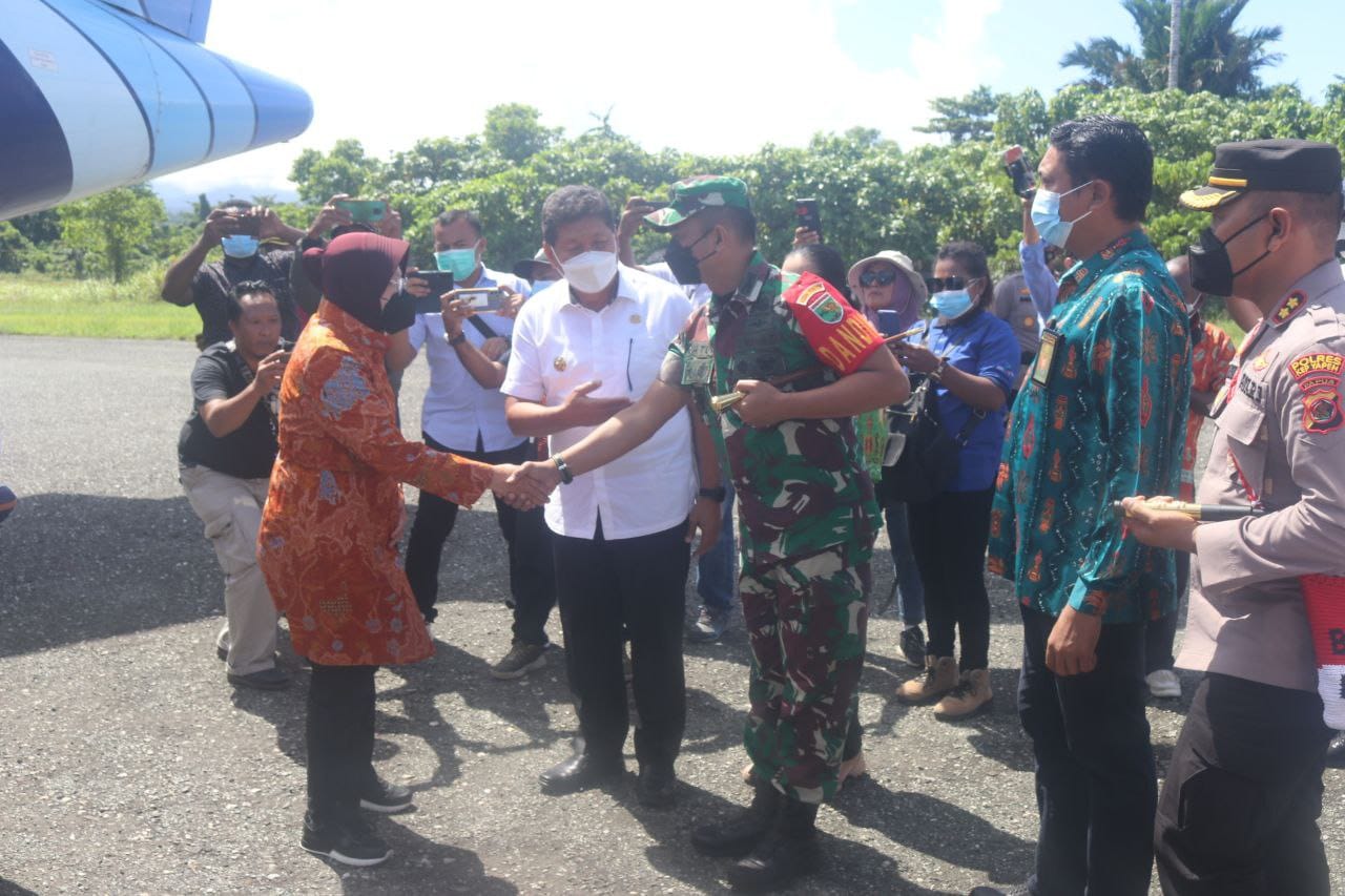 Tiba di Bandara Stevanus Rumbewas Serui Menteri Sosial langsung di Sambut oleh Bupati Kabupaten Kepulauan Tonny Tesar, S.Sos dan Dandim 1709/Yawa Letkol Inf Catur Prasetiyo Nugroho, S,IP., M.IP beserta Forkopimda .