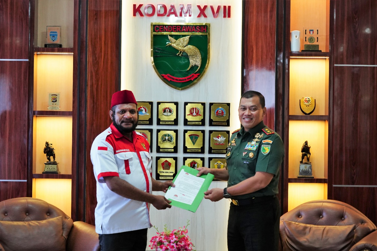Kilaspapua, Jayapura- Panglima Kodam XVII/Cenderawasih Mayjen TNI Teguh Muji Angkasa, S.E., M.M. menerima kunjungan dari Dewan Pimpinan Nasional Gerakan Rakyat Cinta (DPN GERCIN) Indonesia di Ruang Cycloop Makodam XVII/Cenderawasih, Rabu (27/04/2022).