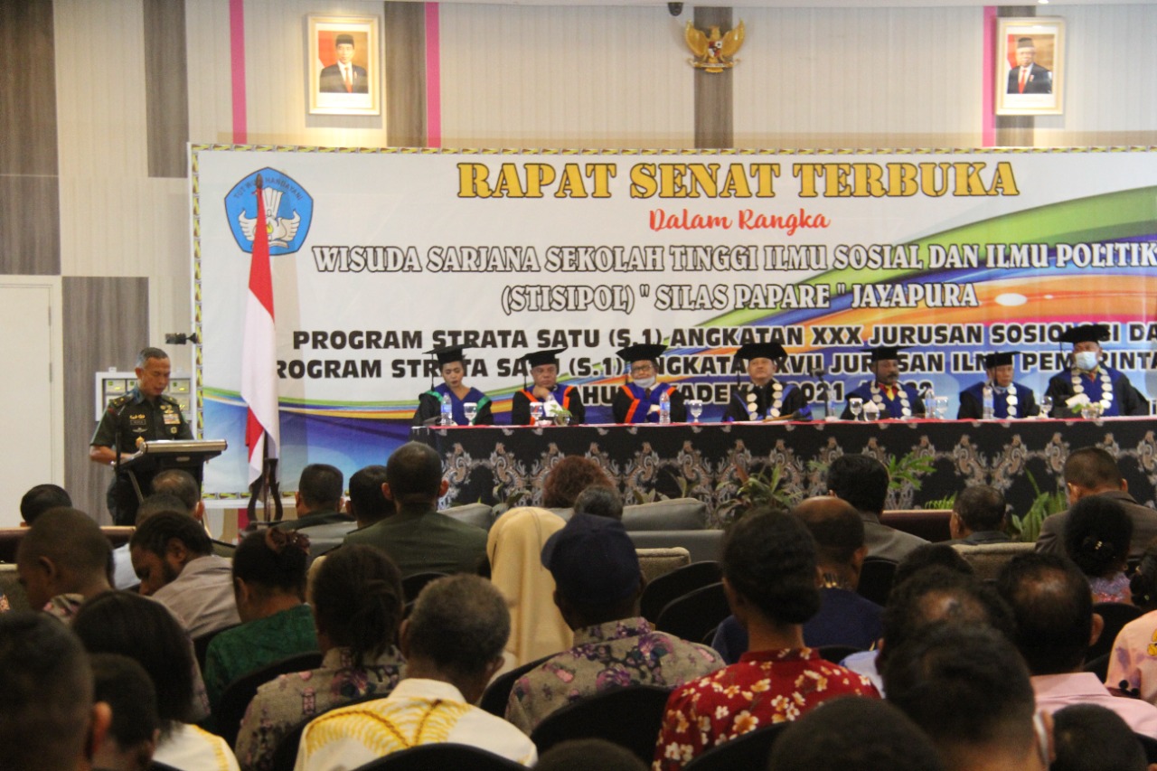 Sementara itu, saat digelarnya wisuda Strata Satu (S1) pada hari ini Kamis (28/7), Pangdam XVII/Cenderawasih dalam sambutannya yang dibacakan oleh Kapoksahli Pangdam XVII/Cenderawasih Brigjen TNI Mudya Widiyanto, S.A.P., mengucapkan selamat kepada 68 orang Wisudawan/Wisudawati atas keberhasilannya menyelesaikan Studi di Stisipol Silas Papare Jayapura yang terdiri dari Program Studi Sosiologi sebanyak 30 orang dan Program Studi Ilmu Pemerintahan sebanyak 38 orang, dari jumlah tersebut sebanyak 82.35%(56) orang adalah Putra Putri Indonesia asli Papua.