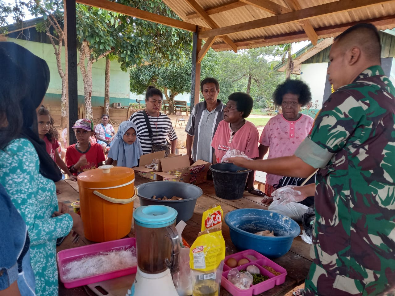 Seperti Halnya yang dilakukan oleh anggota Pos Bupul 12 Satgas Pamtas RI-PNG Yonif 123/RW yang mengajarkan warga perbatasan membuat makanan pempek khas Palembang, Sabtu (02/04/2022).