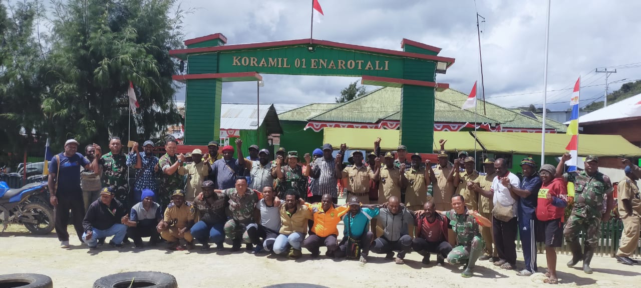 Jajaran Koramil 1703-01/Enarotali saat berphoto bersama dengan Panitia guna mempersiapkan pertandingan bola Voli Danramil Cup.(Foto. Pendam XVII/Cenderawasih)