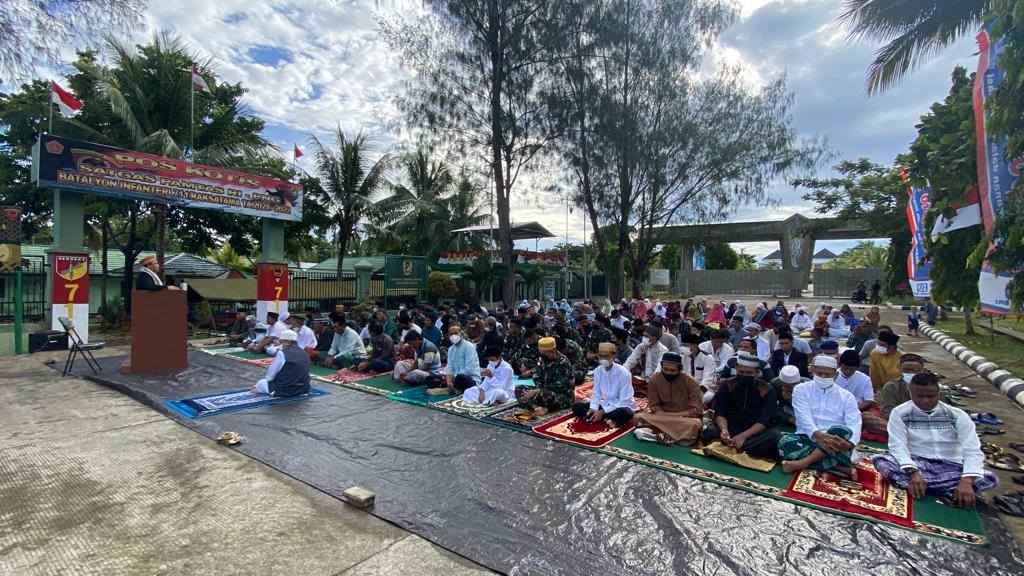 Kilaspapua, Jayapura- Satgas Pamtas Yonif 711/Rks Pos Kotis melaksanakan Ibadah sholat Idul Fitri bersama masyarakat, bertempat di halaman depan Pos Kotis Kampung Skouw Sae, Distrik Muara Tami, Kota Jayapura, Papua, Selasa (2/5/2022).