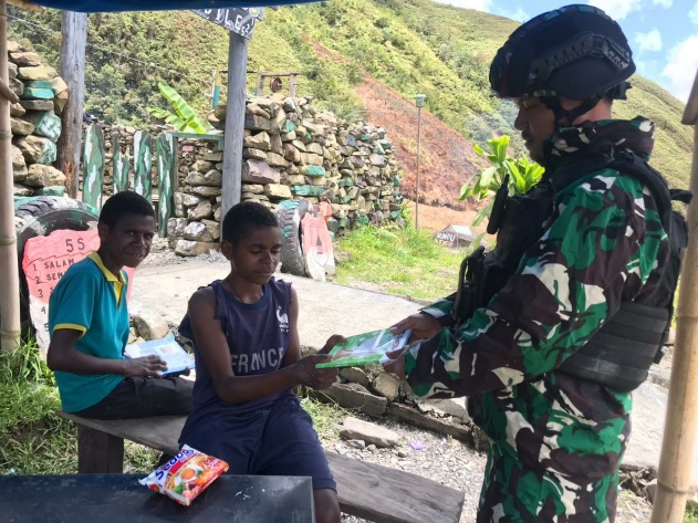 Aparat TNI dari Satgas RK 113/Jaya Sakti saat membagikan buku tulis gratis ke anak-anak kampung Talilime.(Foto. Pendam XVII/Cenderawasih)