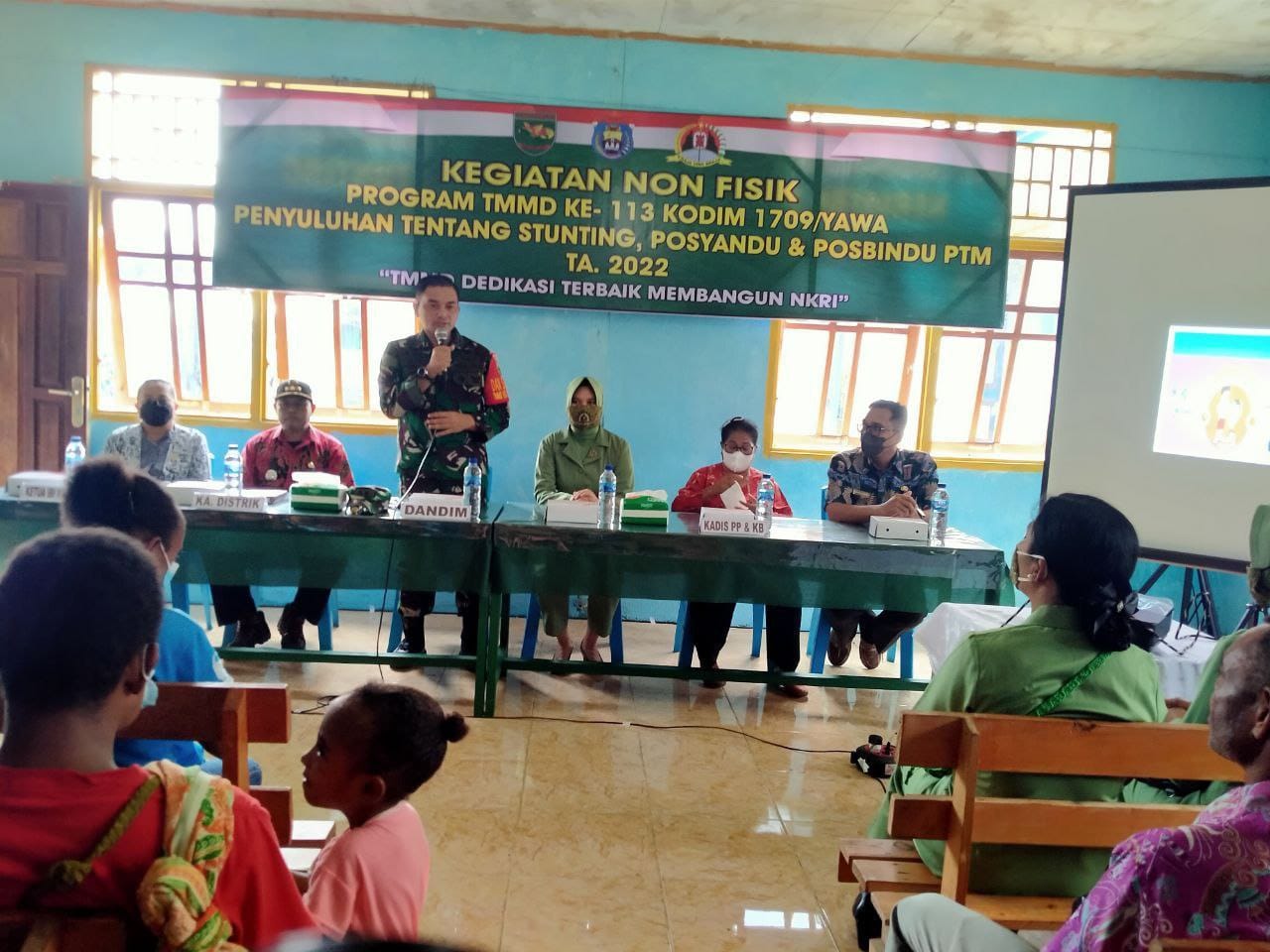 Kilaspapua, Jayapura- Kegiatan Baksos penyuluhan tentang Stunting, Posyandu dan Posbindu PTM TA 2022 dengan tema TMMD Dedikasi terbaik membangun Negeri dalam rangka kegiatan Non Fisik program TNI Manunggal Membangun Desa (TMMD) Ke-113 Kodim 1709/Yawa, yang diselenggarakan oleh Kodim 1709/Yawa di Kampung Poom 1, Distrik Poom, Kabupaten Kepulauan Yapen, Sabtu (14/5/2022).
