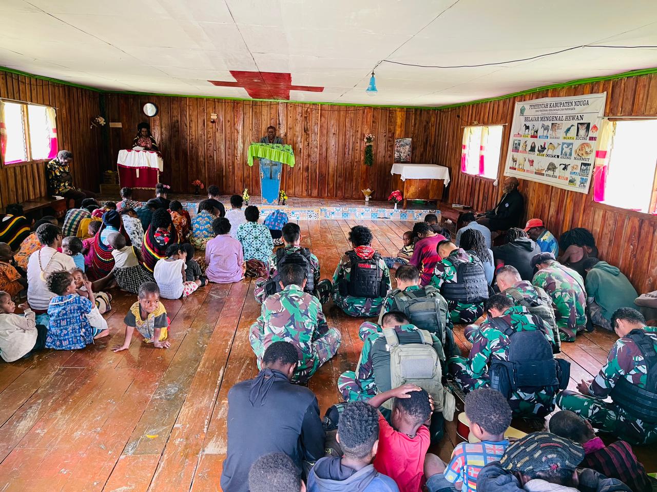 Satgas TNI 321/Kostrad saat mengikuti ibadah bersama warga yang rutin dilakukan setiap hari Minggu.(Foto. Pendam XVII/Cenderawasih)