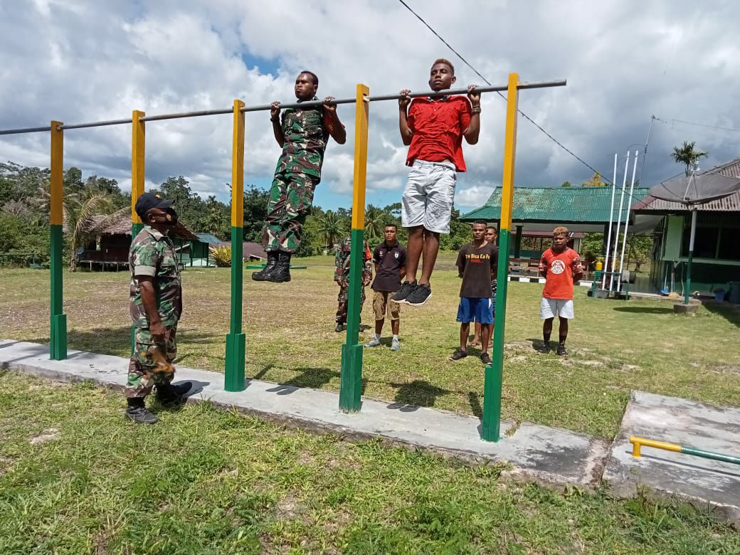 Babinsa Biak Barat saat melatih putra daerah untuk dipersiapkan menjadi calon prajurit TNI AD.( Foto. Pendam XVII/Cenderawasih)