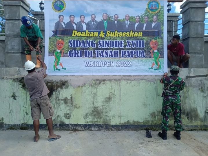 Kilaspapua, Jayapura- Untuk menyukseskan kegiatan Sinode ke- XVIII GKI ditanah Papua, Babinsa Koramil 1709-03/Waropen Bawah Koptu DB Logof terus berpartisipasi membantu jemaat bahkan turut andil pada pemasangan baliho di Gereja Betania Waren untuk menyambut kegiatan yang akan dilaksanakan pada bulan juni ini, Kampung Waren, Distrik Waropen Bawah, Kabupaten Waropen, Sabtu (04/06/2022).
