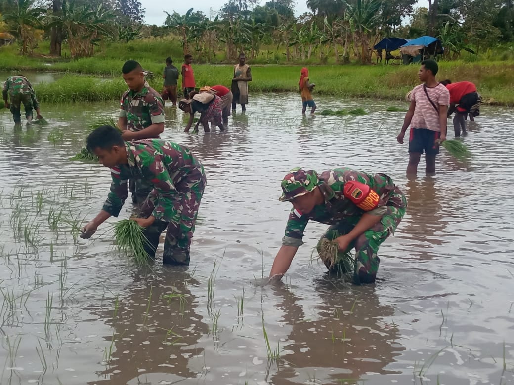 Kilaspapua, Jayapura- Sebagai wujud mendukung ketahanan pangan di perbatasan RI, personel Pos Kondo Satgas Pamtas RI-PNG Yonif 123/RW membantu masyarakat menanam padi di Kampung Kondo Distrik Naukenjerai Kabupaten Merauke, Papua, Minggu (17/4/2022).