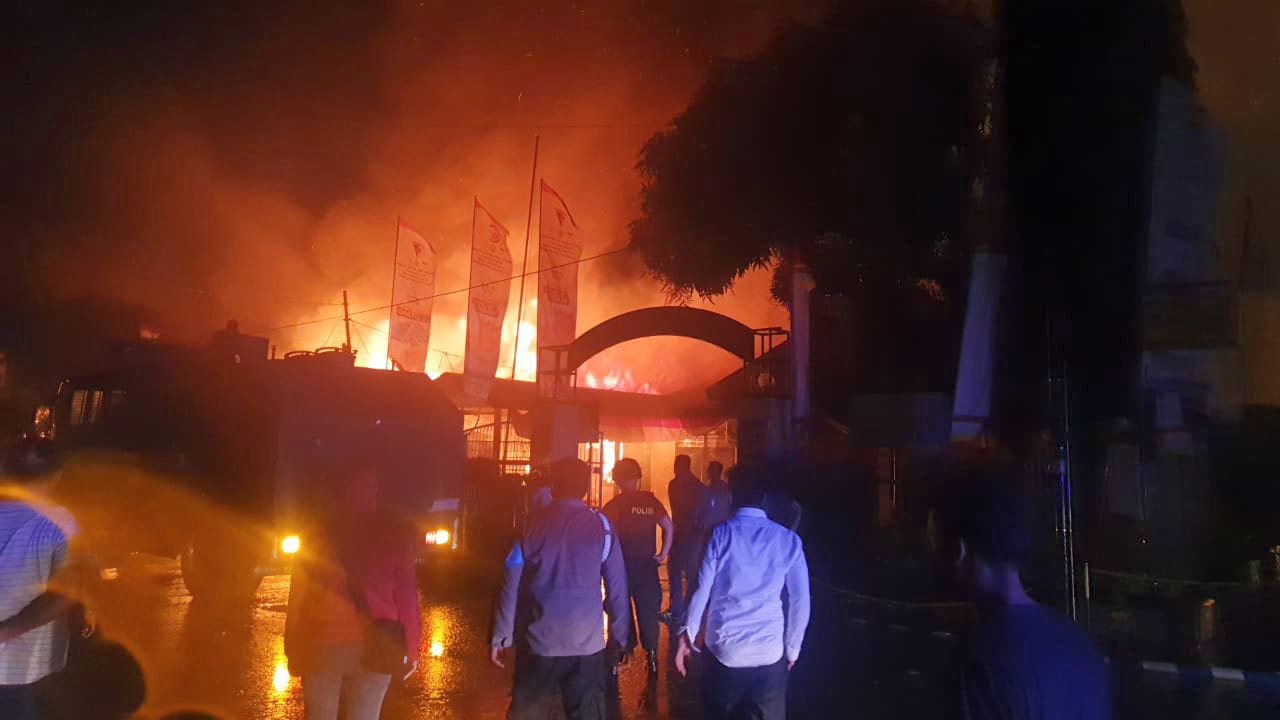 Saat api membakar bangunan termasuk bagian Polsek Kawasan Bandara Sentani kemarin malam.(Foto. Istimewa)