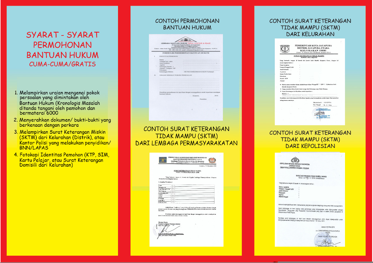 “ Sebelum diberikan bantuan hukum, maka orang miskin bersangkutan lebih dulu membuat surat keterangan tidak mampu dari kelurahaan kemudian setelah itu disampaikan kepada LBH Papua Justice & Peace. Bantuan hukum ini khusus berlaku bagi warga sipil yang berkategori miskin atau kelompok miskin dan tidak berlaku bagi PNS baik dari TNI maupun Polri,” katanya.