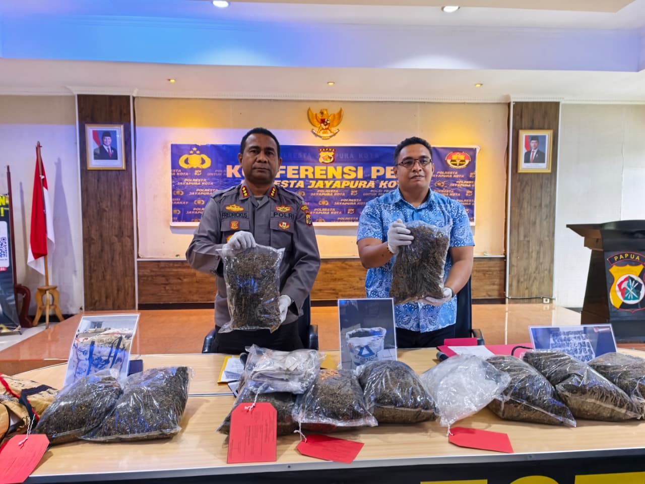 Kapolresta Jayapura Kota, Kombes Pol Fredrickus W. A. Maclarimboen, S.I.K., M.H., CPHR didampingi Kasat Resnarkoba AKP Febry V. Pardede, S.T.K., S.I.K pada press conference di Aula Mapolresta Jayapura Kota mengatakan, Keberhasilan ini bermula dari penangkapan polisi PNG di wilayahnya yang kemudian satu terduga pelaku warga WNI yang kabur melalui laut sambil membawa narkotika jenis ganja.