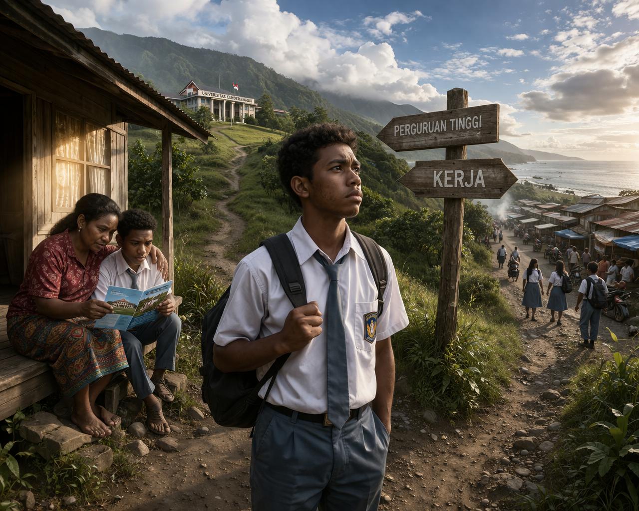 Setiap tahun, siswa SMA di Jayapura memilih antara kuliah atau bekerja. Angka Partisipasi Kasar (APK) Perguruan Tinggi Papua yang hanya 32,89 persen pada 2025 terendah kedua di Indonesia, bukan sekadar angka melainkan gambaran banyak mimpi yang terhenti karena keraguan, minimnya informasi dan tekanan ekonomi.