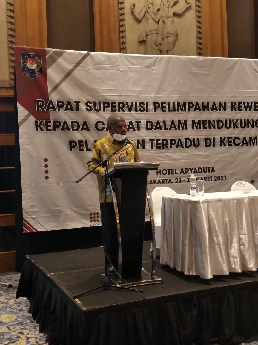 Kilaspapua, Sentani- Bupati Jayapura, Mathius Awoitauw, SE, M.Si menghadiri rapat Supervisi Pelimpahan Kewenangan Kepada Camat Dalam mendukung inovasi Pelayanan Terpadu di kecamatan dengan Dirjen Bina Administrasi Kewilayahan Kementerian Dalam Negeri di Jakarta, Rabu (24/3/2021).