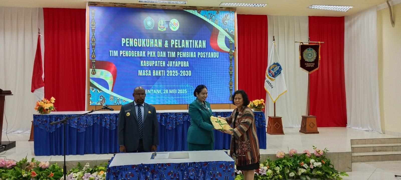 Kilaspapua, Sentani – Bupati Jayapura, Yunus Wonda mengukuhkan sekaligus melantik Dewi sartika Sibarani Yunus Wonda sebagai ketua tim pembina posyandu Kabupaten Jayapura masa bakti 2025-2030 sekaligus pengukuhan ketua PKK Kabupaten Jayapura. Pelantikan berlangsung diaula lantai II kantor Bupati Jayapura dengan disaksikan oleh Sekda Jayapura, Hana Hikoyabi, Kapolres Jayapura, AKBP Umar Nasatekay serta para kepala OPD dilingkup Pemerintah Kabupaten Jayapura, Rabu (28/5/2025).