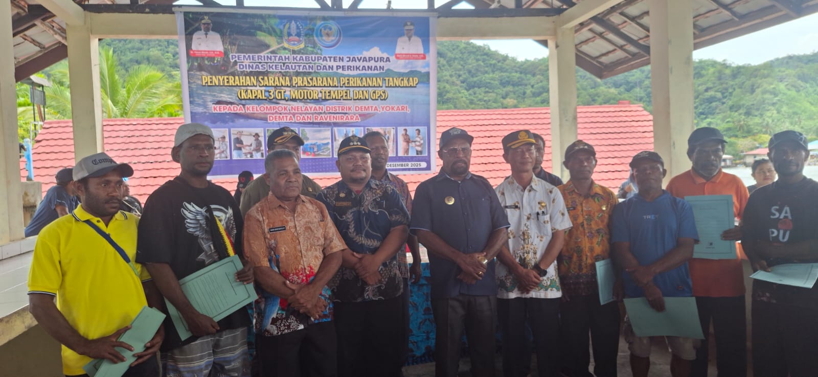 Kilaspapua, Sentani – Pemerintah Kabupaten Jayapura melalui Dinas Kelautan dan Perikanan (DKP) menyerahkan bantuan perikanan tangkap berupa, 3 unit kapal tangkap GT, motor tempel, dan GPS kepada 4 kelompok nelayan di Distrik Depapre, Demta, Yokari, dan Revenirara. Bantuan tersebut diserahkan langsung oleh Bupati Jayapura, Dr. Yunus Wonda, S.H., M.H., di Pangkalan Pendaratan Ikan (PPI) Waiya, Distrik Depapre, Kamis (4/12/2025).